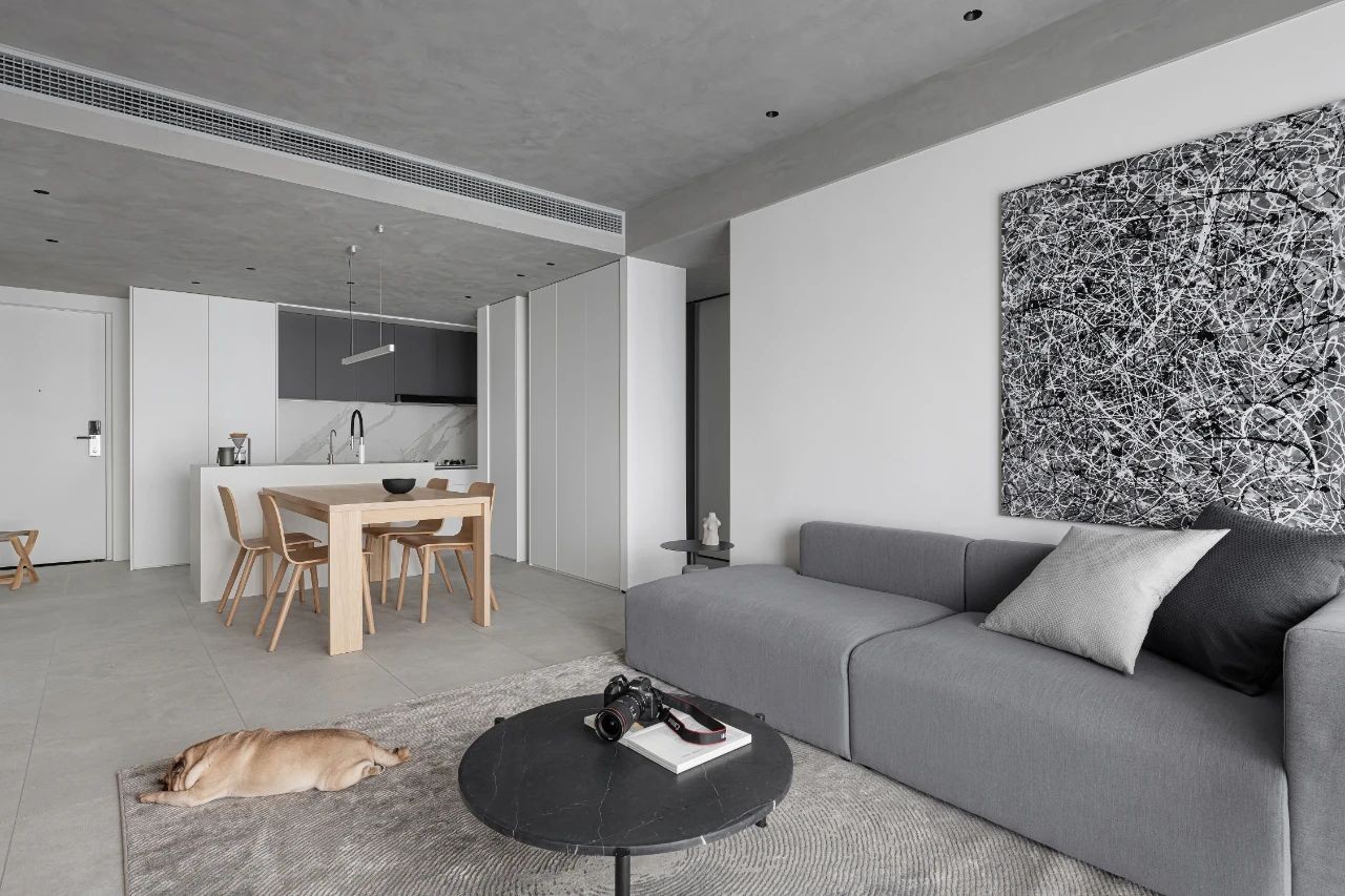 客厅顶面延续了餐厅和厨房的无主灯设计,用仿水泥的艺术漆装饰顶面,丰富和***的质感与地面的水泥砖呼应。顶面内嵌的射灯采用无边框设计,让顶面更加极简。