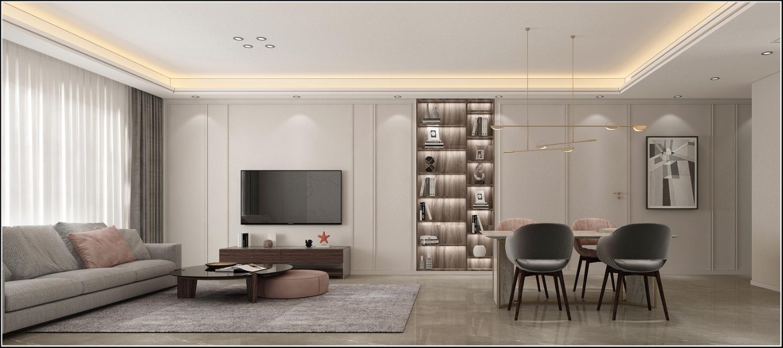 现代的设计手法,简约的线条和金属元素有趣的结合,空间的每一处细节设计匠心考量,呈现摩登的都会感、凝练的现代感、精致的生活平直和多元的轻奢主义,目光所及之处皆有惊喜。温柔且***的灰粉色,精致又撩人,符合女主人的摩登气质,恰到好处地提升了新家的情调和气质。