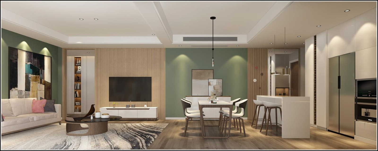 一个年轻家庭的现代风格平层,面积130㎡,引进国外的生活方式,中厨和西厨岛台的结合,非常宽敞且实用,入户镜面设计,利用自然光线、灯光,为室内带来通透明亮的视觉感受,搭配了大量的木质元素,以最简单的方式创造出温暖与舒适。