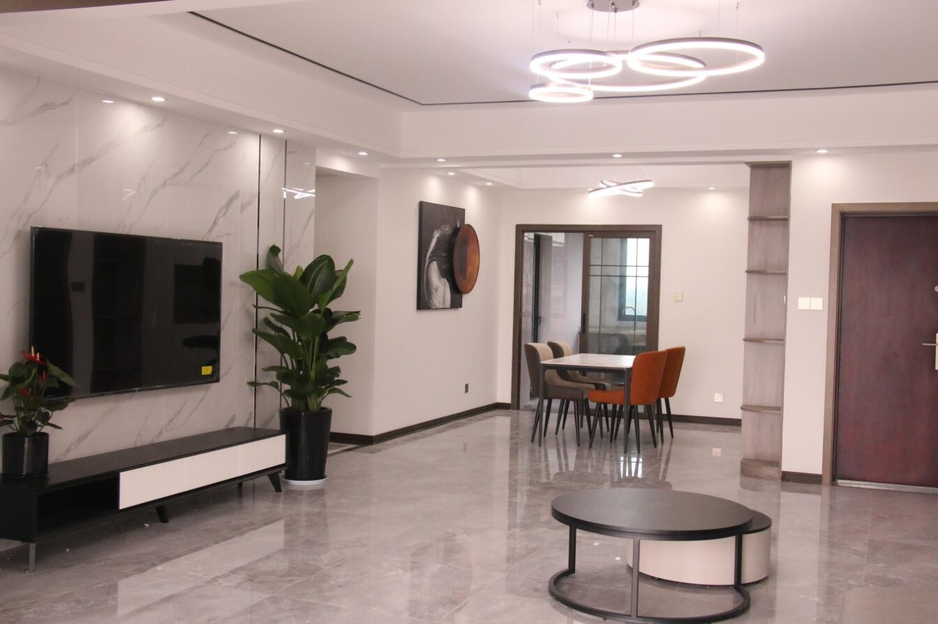 客厅整体风格确定为现代简约,原始客厅和阳台间墙体隔断,在设计这一处区域时,考虑到空间通透性和采光,设计师拆除墙体,将两个空间融合,使其生活动线具有实际使用意义。