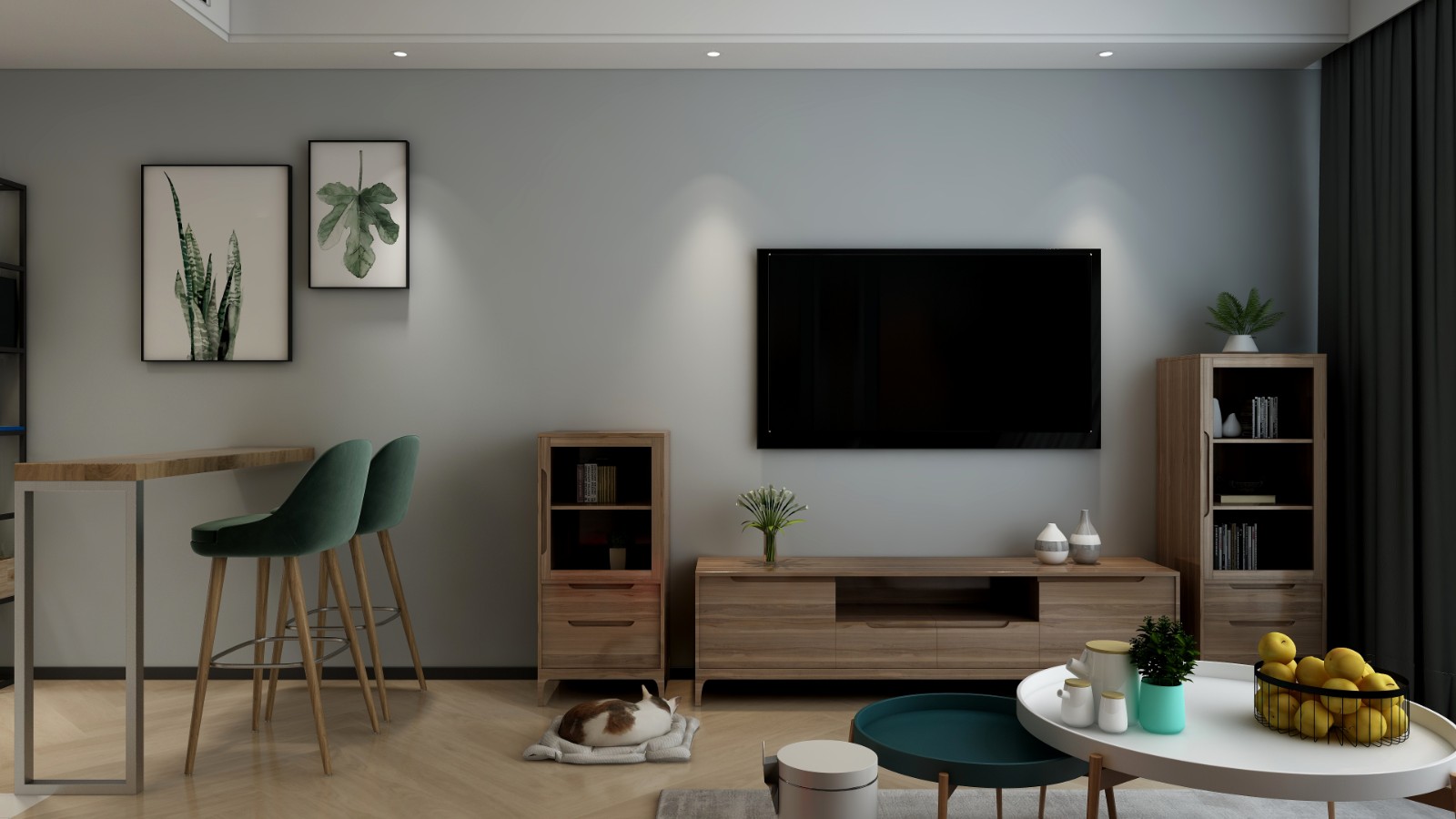 背景墙以灰色为主,沙发与电视柜加入了复古元素。