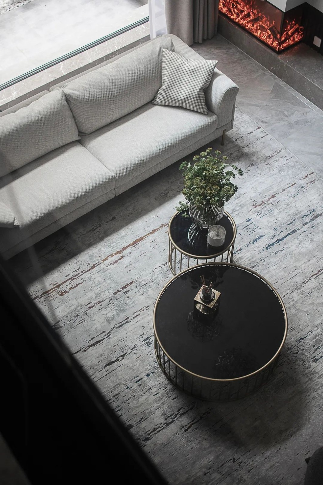 不同的材质平衡空间冷暖,利落大气的石材,柔软舒适的布艺,再加入壁炉的温暖火光,互相渗透为一个整体。质地、色彩之间的过渡与差异,丰富了视觉效果,彰显低调生活中的幽默意趣。