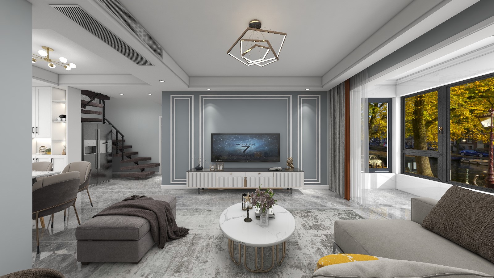 现代简约风色彩简洁,主要以浅色系为主,背景墙以灰色为主,加上点线条的修饰,简洁又不失内涵