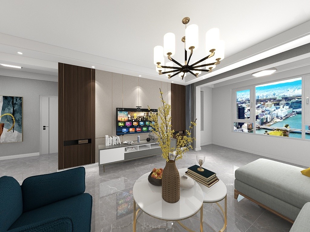 客厅布艺沙发搭配金属质感茶几架