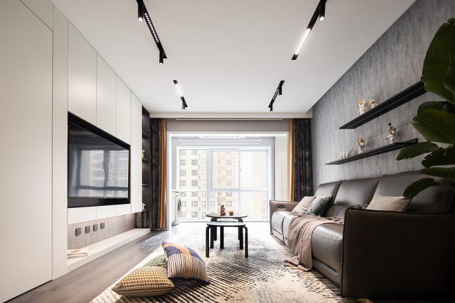 客厅以沉稳的黑白灰为基调,增加空间质感和通透感,降低原本狭长空间带来的局促感。