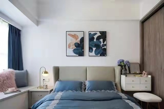 简洁大方的卧室,以质感舒适的皮艺床,搭配素雅的床单与地毯,床头墙还挂上两幅蓝灰色调的的底片效果装饰画,带来优雅华丽的卧室空间感。