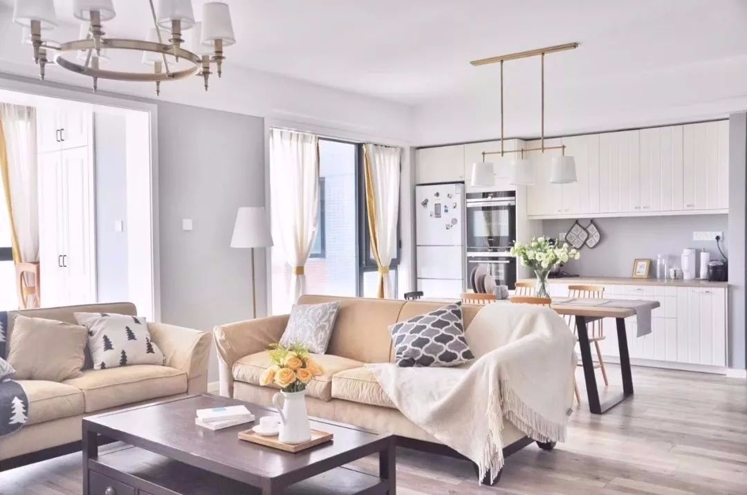 L型摆放的两张双人沙发,可以容纳更多的客人。米色的布艺沙发搭配棕色的茶几,很有美式风的感觉