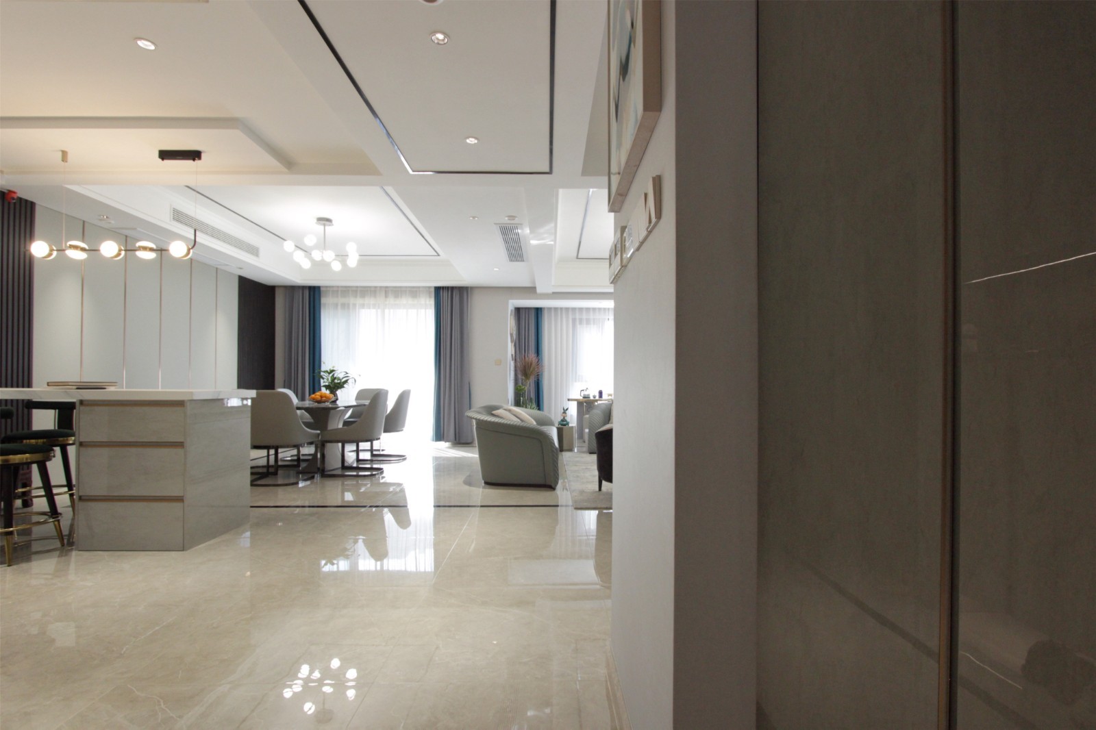 从玄关步入客、餐厅的过程,拆除多余墙体,引入大量采光,颇有为访客创造的豁然开朗之美。