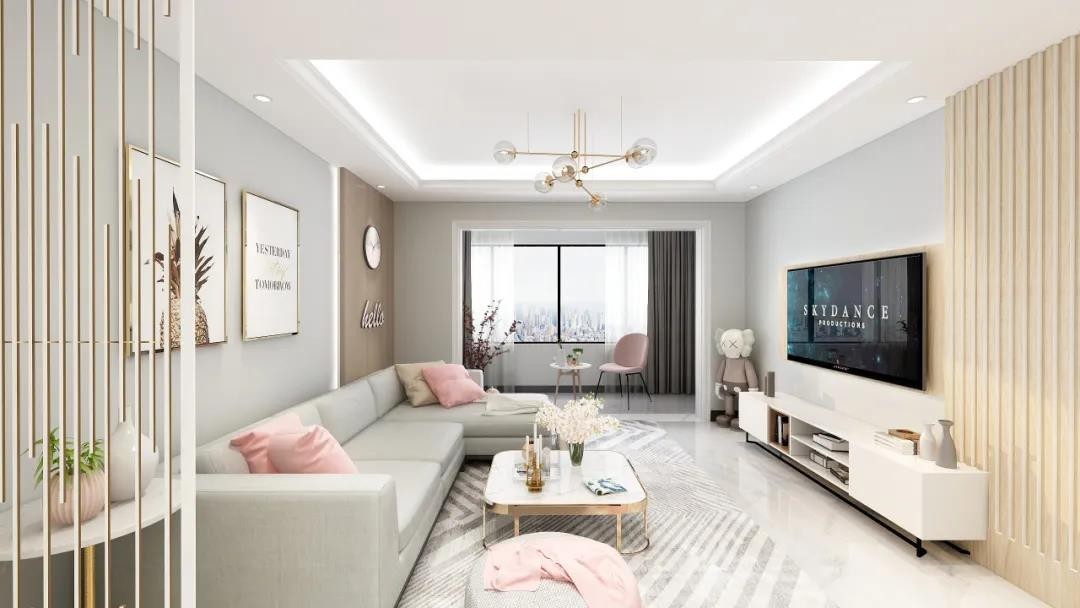 客厅大面积使用气质优雅的***灰,时尚前沿的***色调,在这样的色调中,注入一抹活力满满的浪漫粉,给清冷的气息中加入一丝温柔