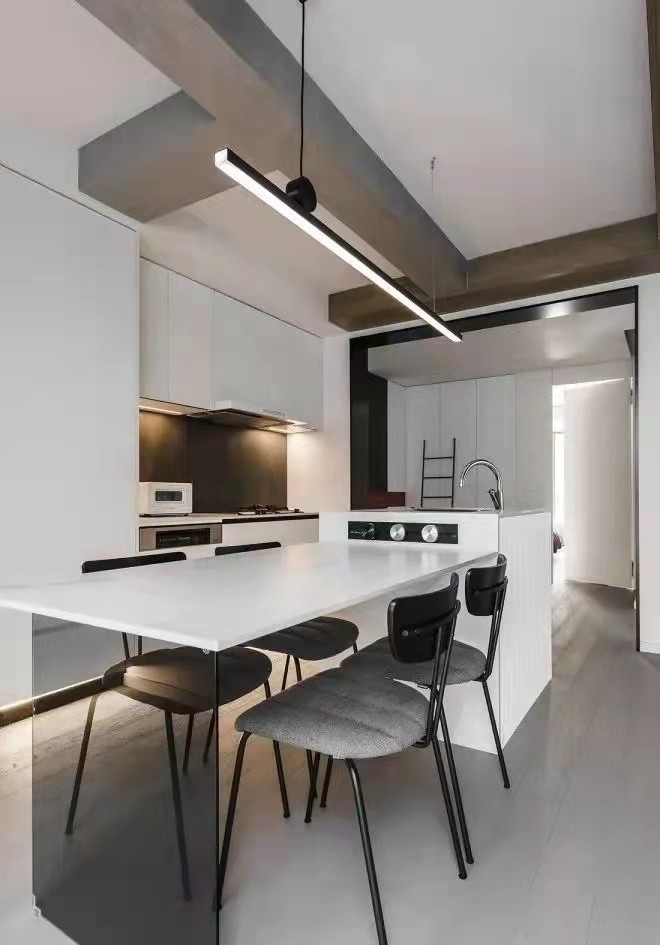 餐桌采用岩板一体化定制,完美匹配空间格局。洗碗机、蒸烤箱、双开门冰箱则采用统一内嵌设计,带来立面上的***平整。