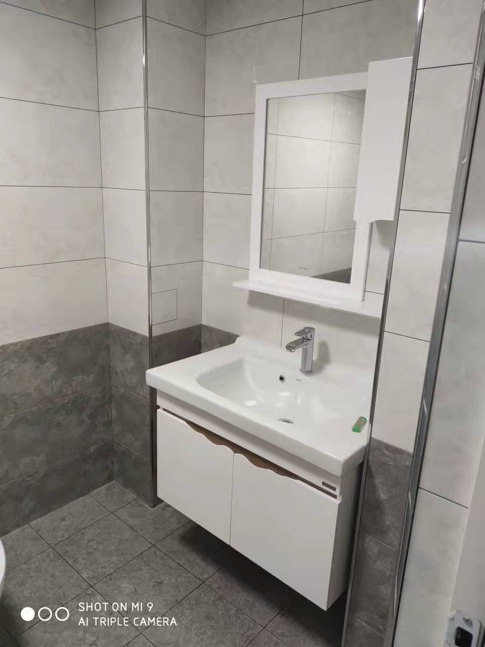 卫生间的墙砖业主选择了现在比较流行的上浅下深的颜色