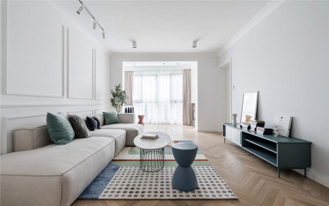 餐厅望向客厅视角,光线无限好,素净,但不单调。 客厅无主灯,光照基本靠四个明装筒灯和四个轨道灯来照明。