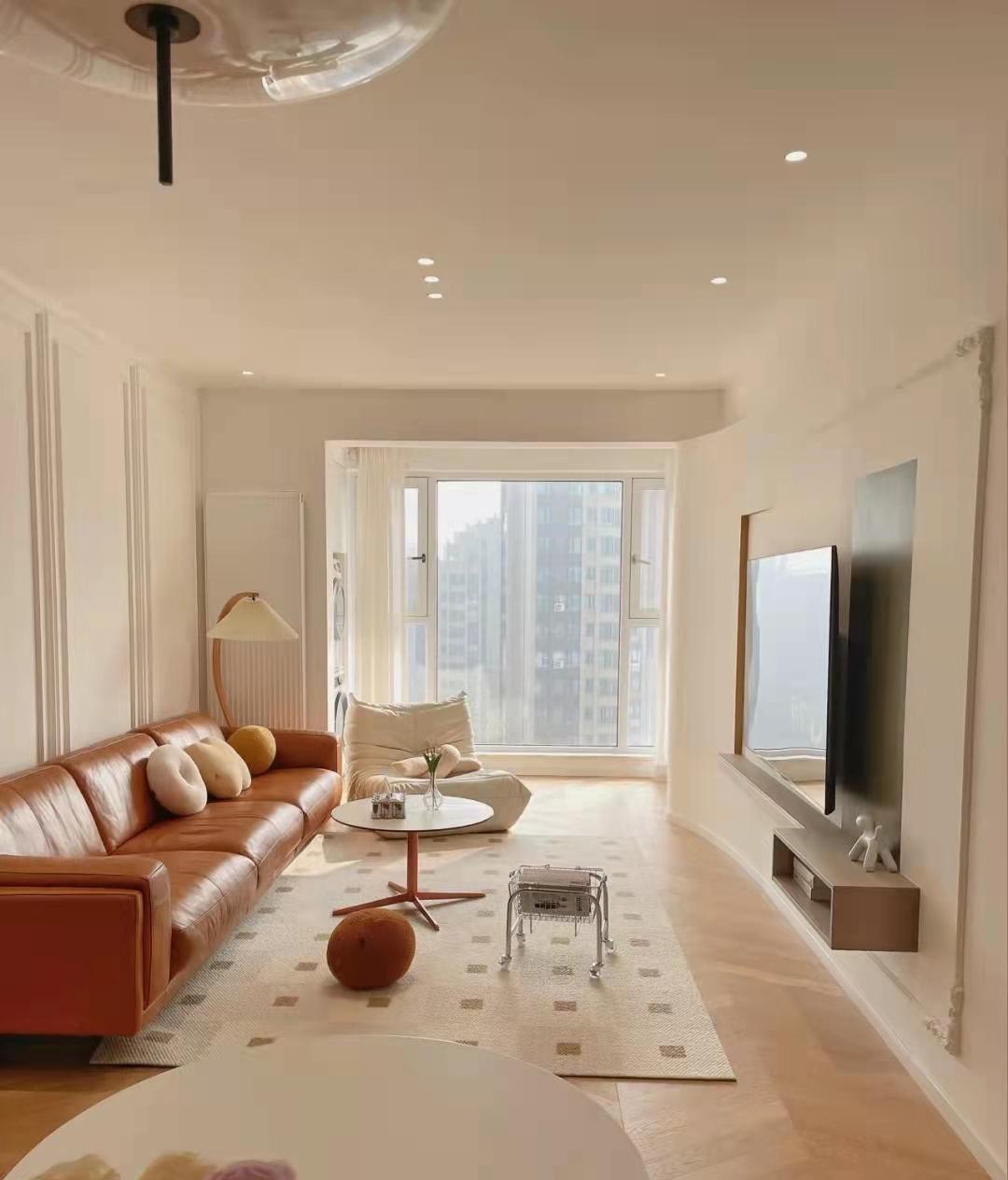 全屋无主灯+平吊顶,显得很通透简洁,电视背景墙做了圆弧的造型,还加了一半的石膏线,设计感满满,却又不占空间