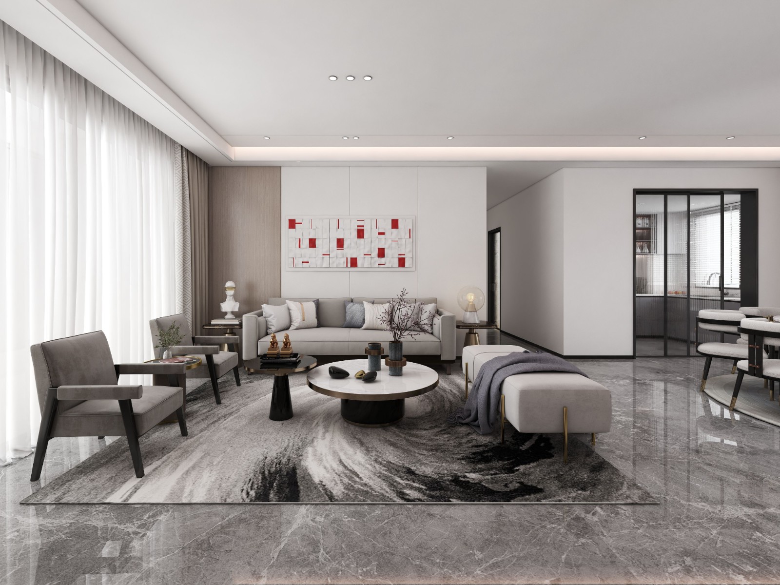 户型进行了比较大的改动,主要体现在书房与客厅区域的屏风式设计方面