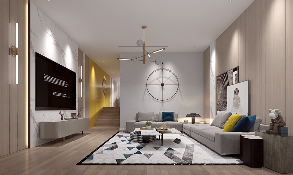 客厅空间板块线条比例到位,简单而精致。地毯以及抱枕的配色在黑白灰中让人眼前一亮。从客厅简约内敛的色调中可以看出房子主人的审美稳重且脱俗。整体设计理念注重简约而不失时尚。