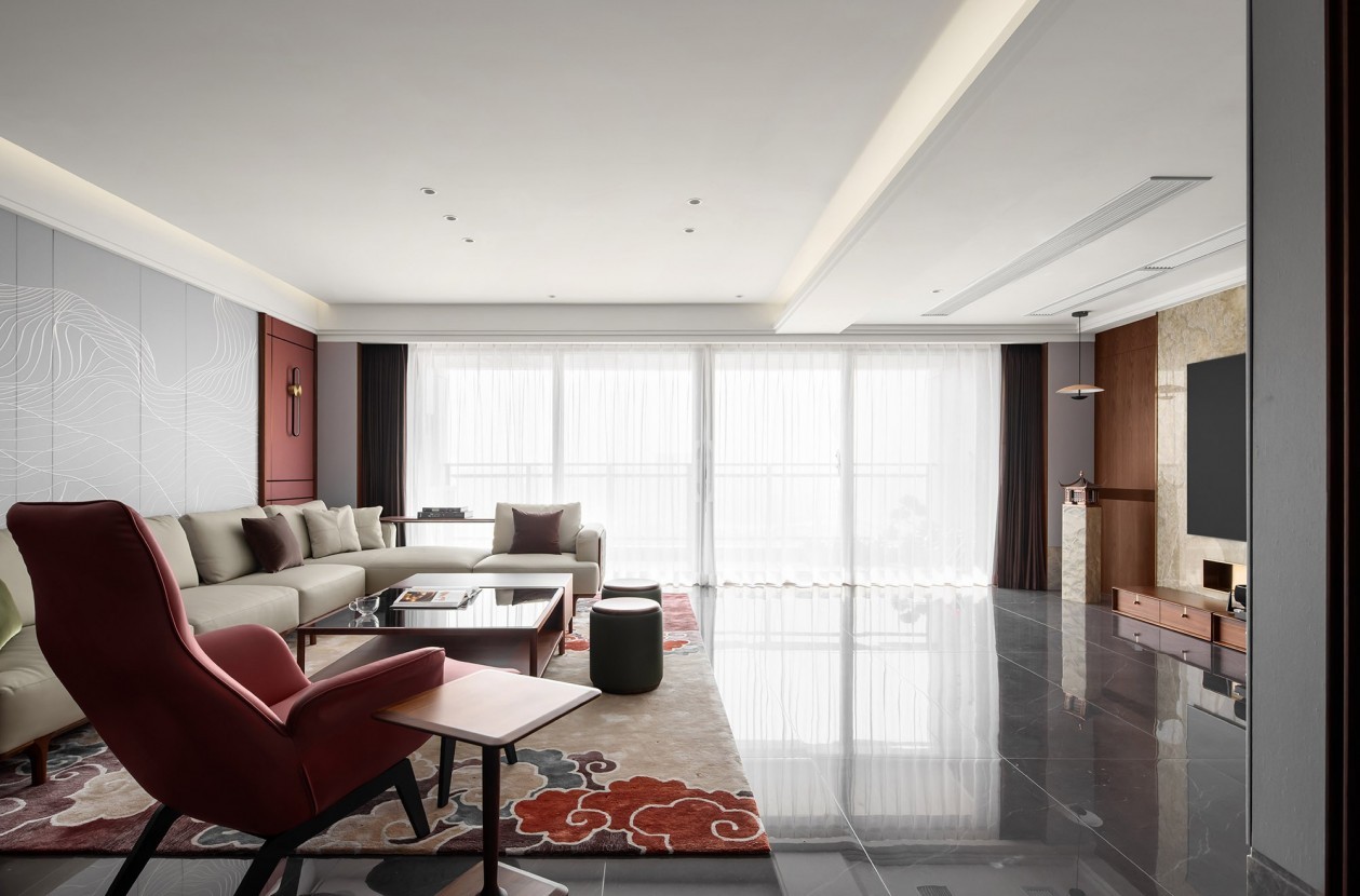 如同山水画卷的客厅空间,将视觉焦点移至下方,预留出舒缓向上的轻灵形态,让自然的天光与陈设摆件一起,绘就生活的品味和美好。深浅得当、冷暖适宜的配色,提炼出新中式的内涵特色,清晰展现出空间的温度、情怀、意趣。