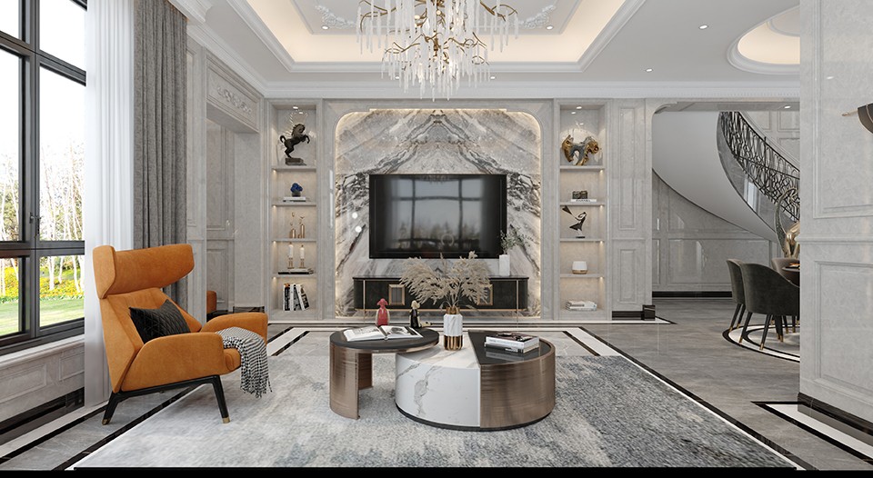 客厅墙面以自然感的米色系作为主色调,搭配白色大理石及原木作为点缀提升了空间的整体质感。 以空间作为媒介,展现出随意且自由的生活方式。阔叶绿植的穿插,更能让人沉浸在这一方舒适空间里。