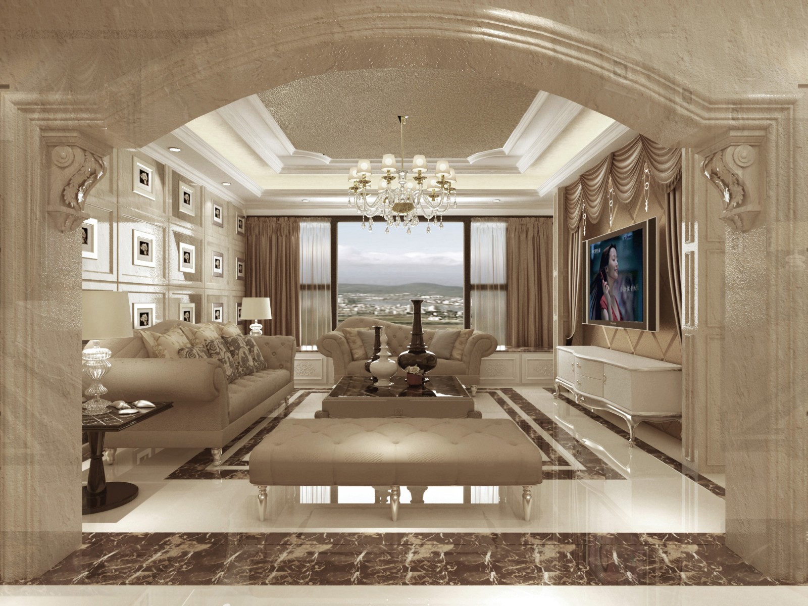 歐式風格豪華客廳使用大量莎安娜米黃石材