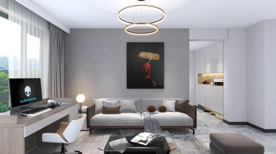 客厅采用灰色系,视觉上耐看,将办公区设置在客厅,极大地利用了空间