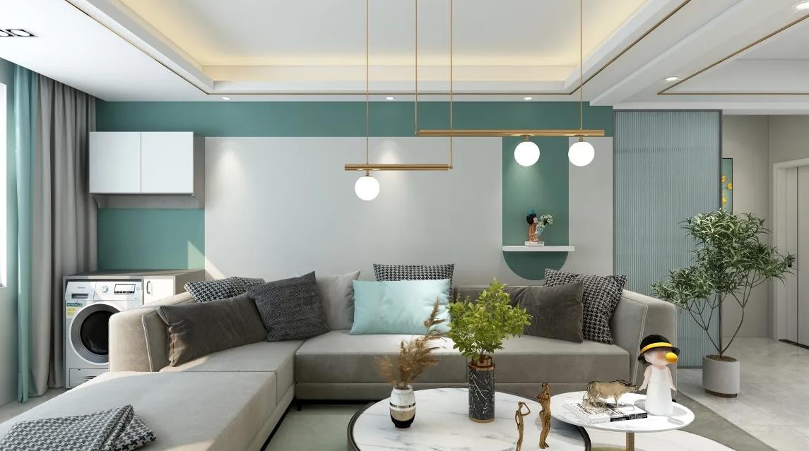 客厅采用白色为主的墙漆,少部分的灰绿色做几何图案点缀,将阳台和客厅结合,视觉上客厅面积增加,空间扩大