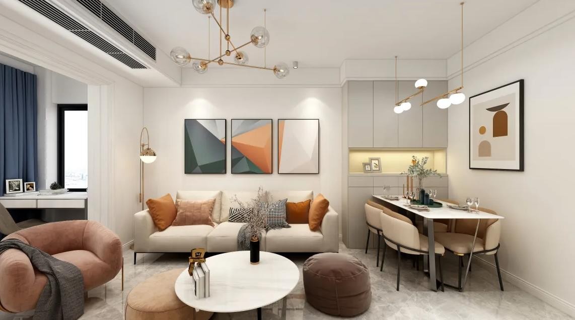 客厅整体设计偏向于暖色系,色调颜色统一,