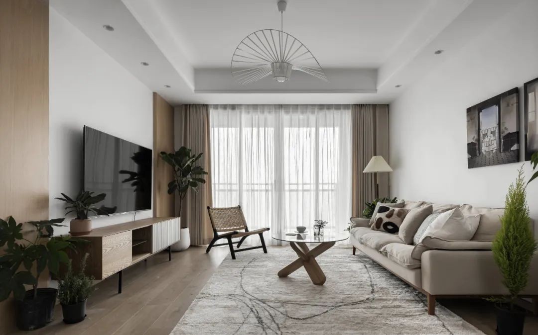 整个客厅以白色为主,搭配原木色木饰面和地板,给人一种舒适,温暖的感觉,绿色的植物为点缀,使空间清新脱俗。