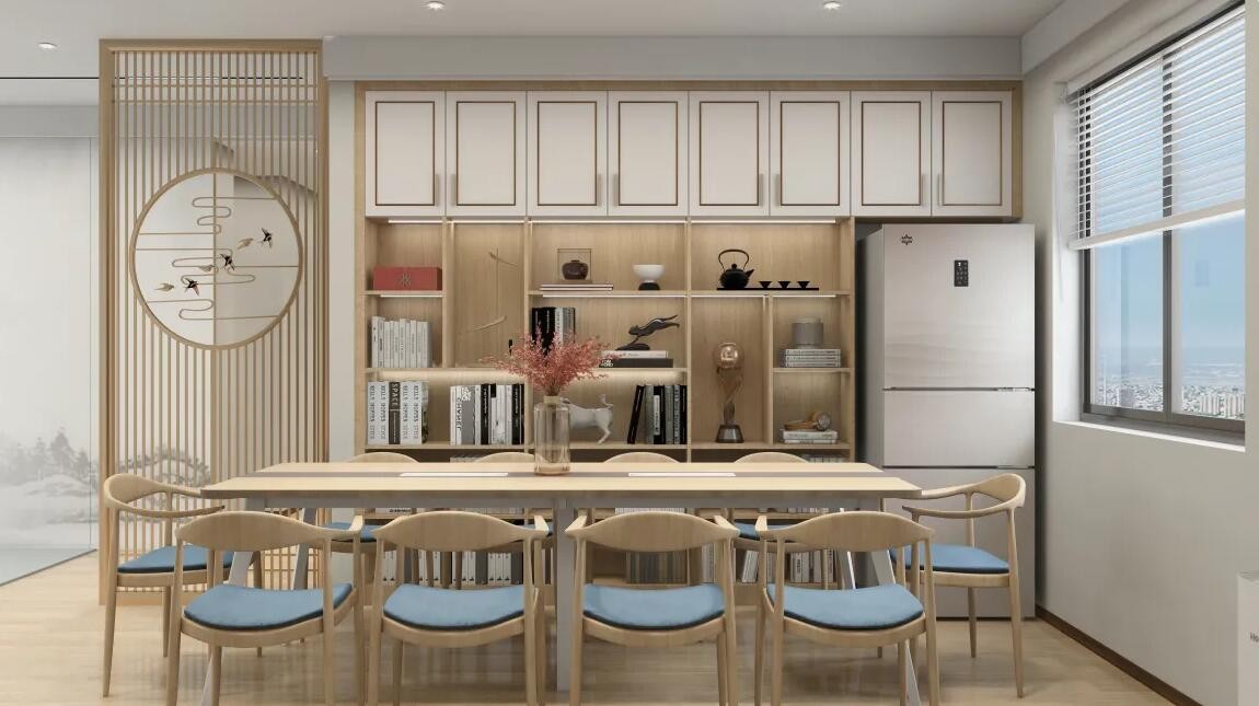 墙面选用浅咖色,家具以木色为主,将简约与中式家居风格融和起来,给与人忙碌奔波之余一处宁静舒适且治愈的休闲驿站。