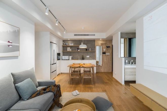 拆掉原精装房的猪肝色地板,是打造日式风格,简洁、干净的现代日式客厅以浅色、素色系为主,看上去清新简单。
