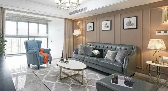 电视背景墙、大理石地面的相结合,既美观又有空间感,沙发背景墙整个用奶茶色调染,显得更加温柔有品味。