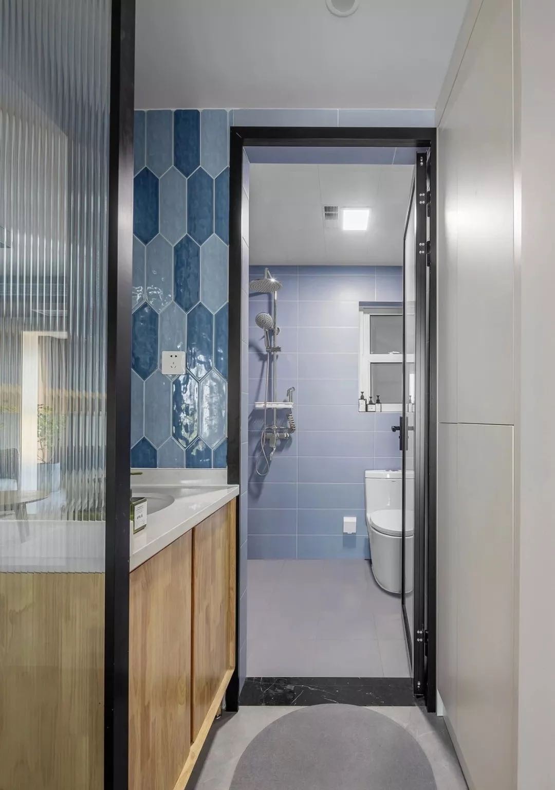 卫生间干湿分区,提高使用效率,长虹玻璃做隔断与门片,干湿区采用蓝紫色瓷砖过度搭配