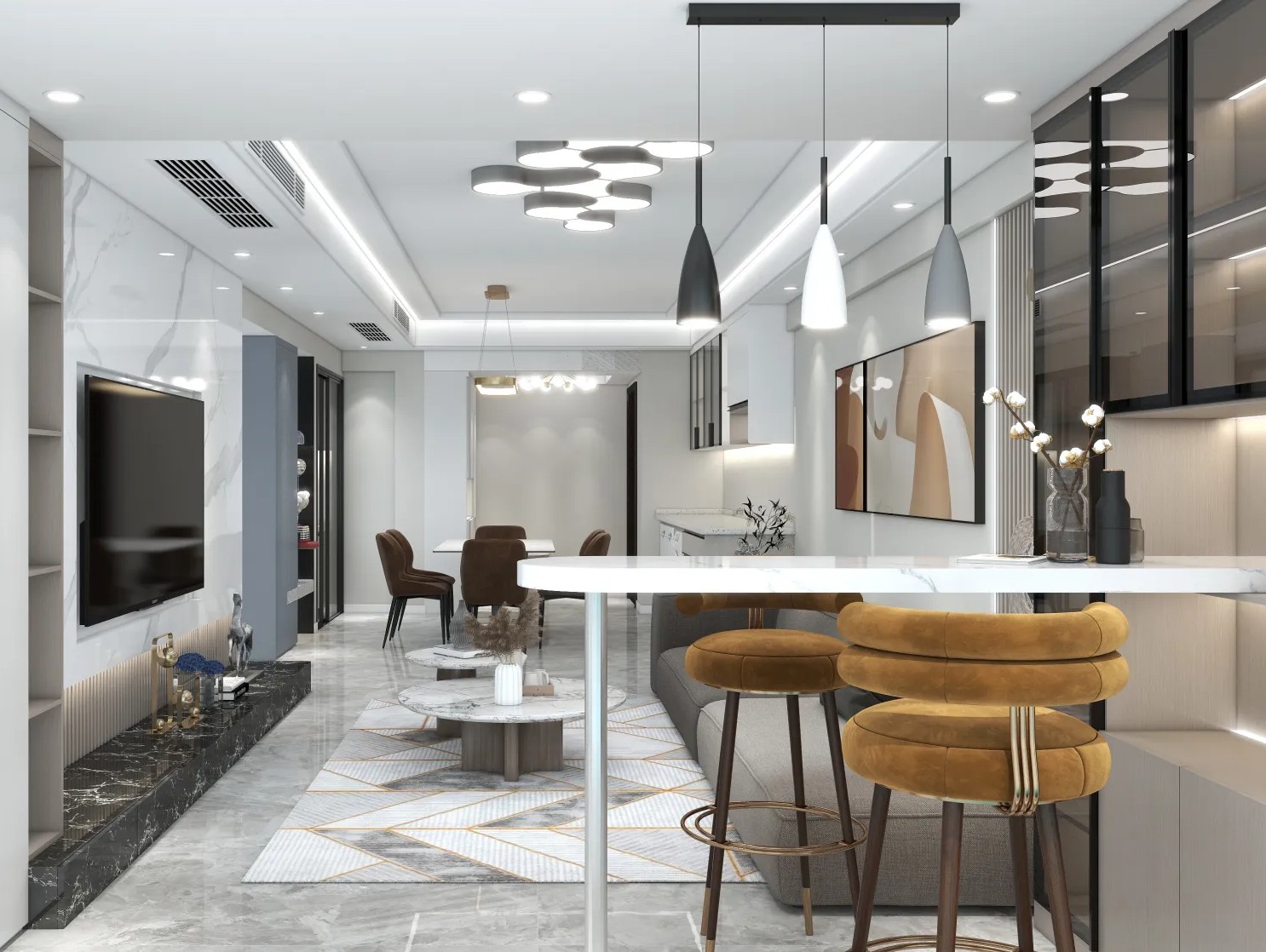 客厅整体选用了光线感比较强突出了现代轻奢感