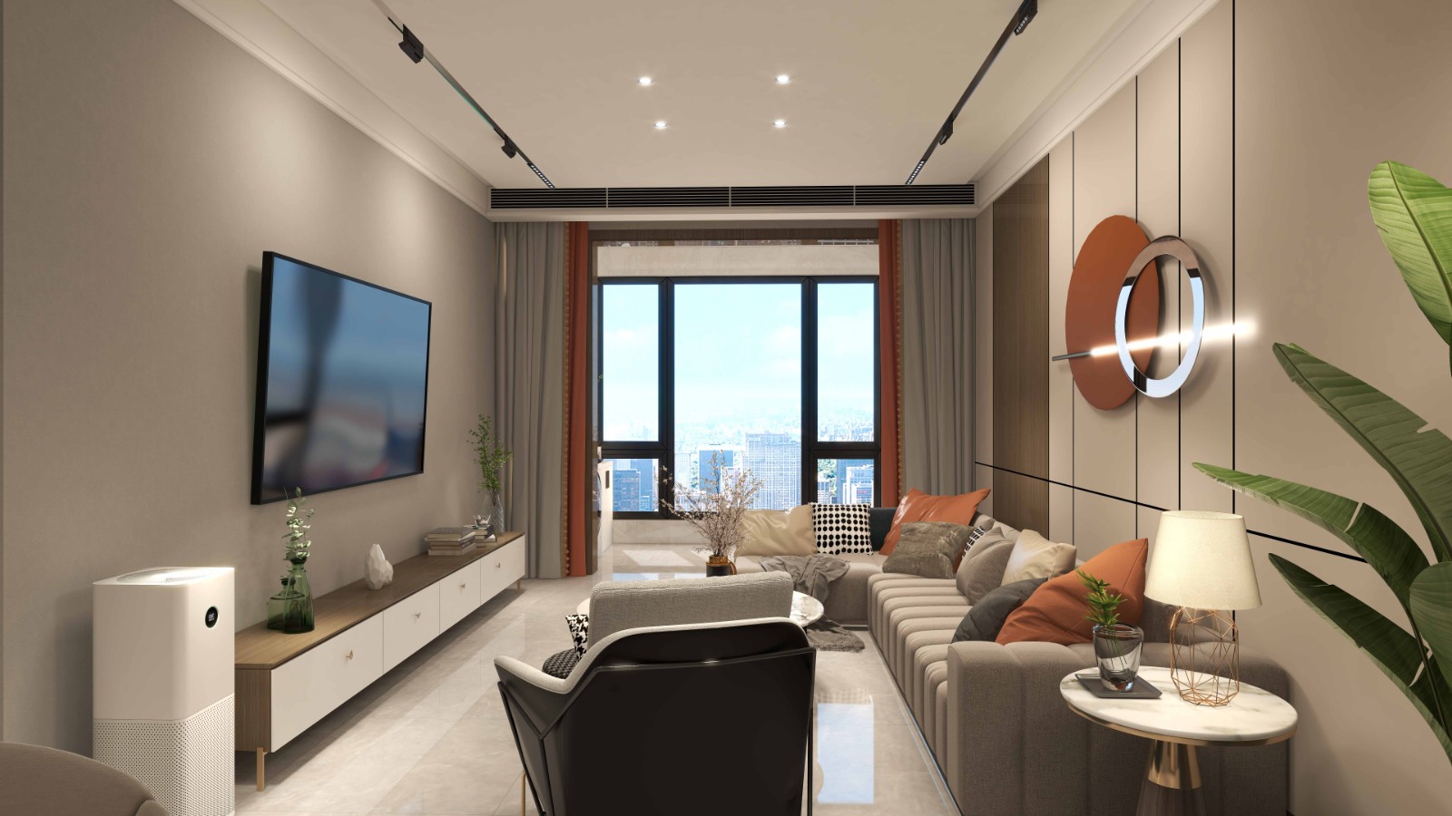 客厅无主灯设计,顶面采用筒灯和磁吸轨道灯