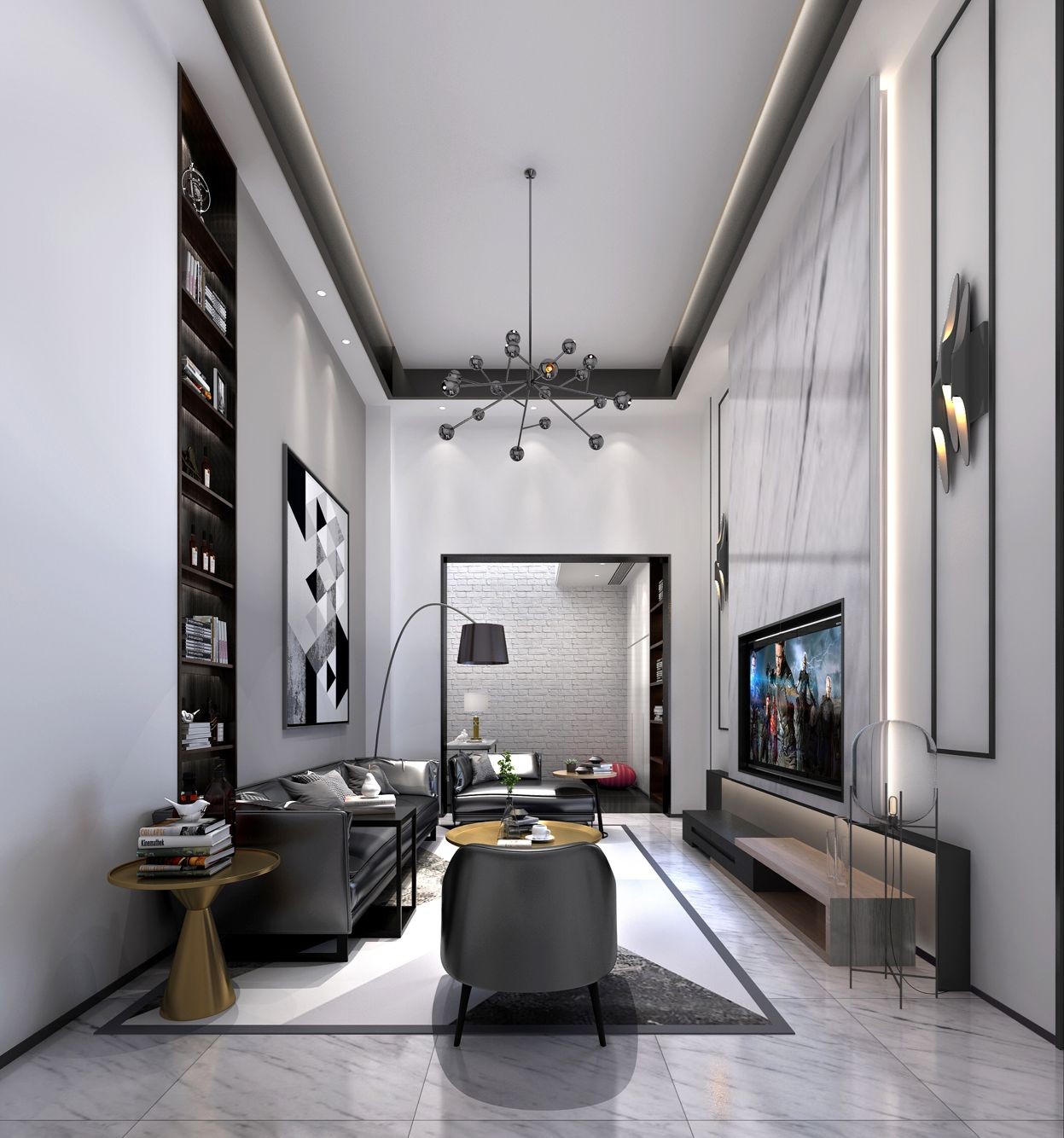 地下2层的客厅,是一个整体挑高的空间,总高度达到5500,整个空间以白色及深木色呈现出黑白灰最美的样子