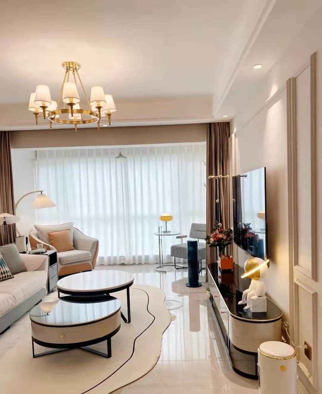 客厅通刷了奶咖色漆,很温柔的颜色,在日常光的展示下很暖很温馨。客厅装了法式吊灯,营造出满满的法式风格,阳光下折射水晶般晶莹剔透的光。