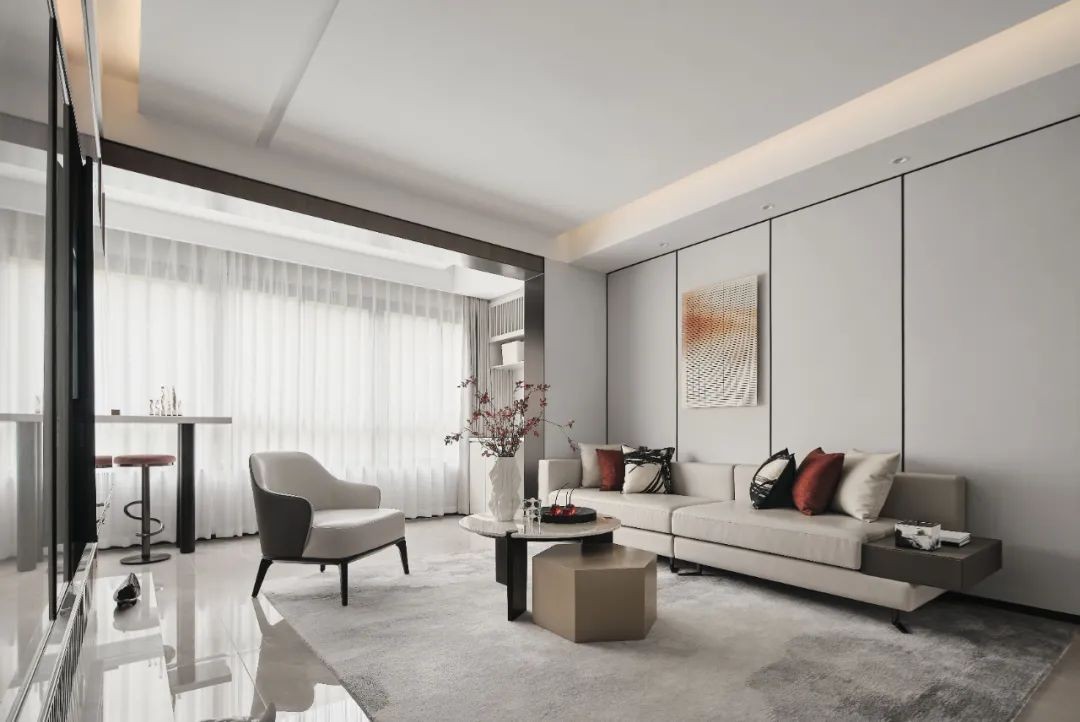 米白色的皮革与灰白晕染的地毯,只需几个暗红色的抱枕, 温润如斯的东方气韵便冉冉的生起,又稳稳的落地。