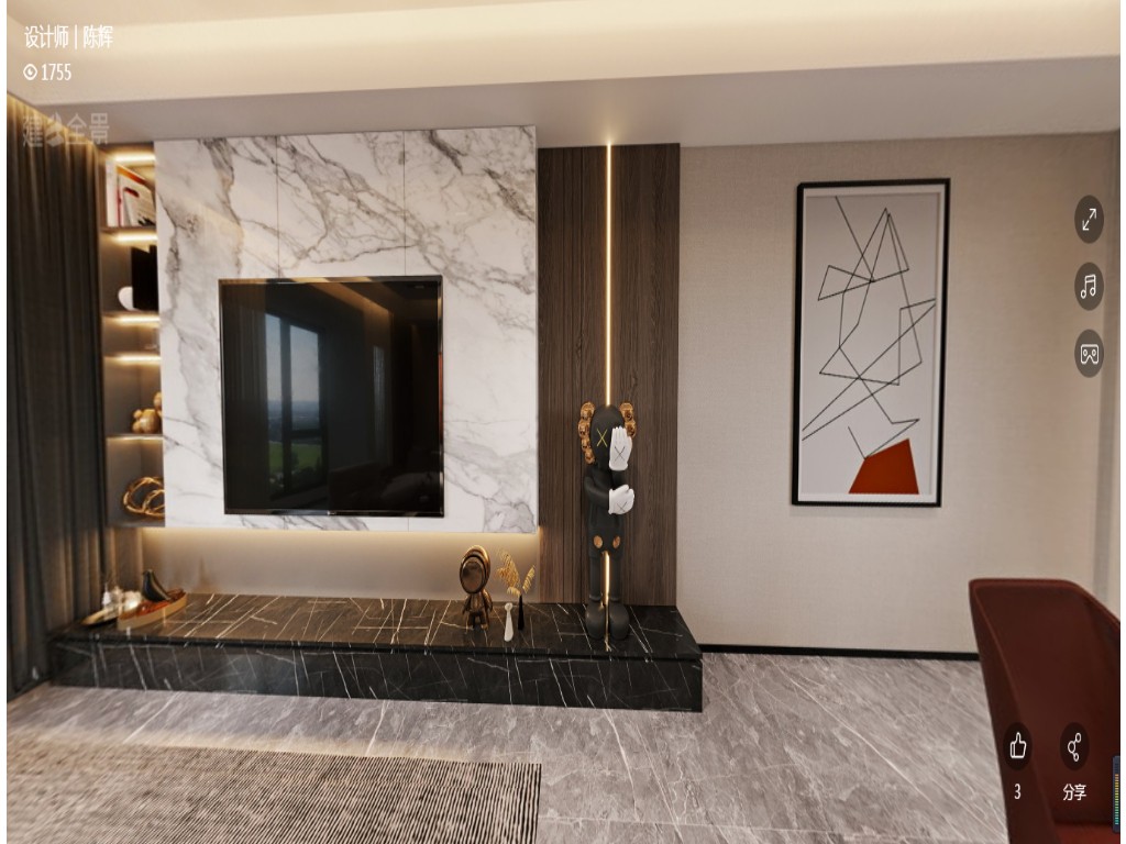 大面积的木饰面作为电视机背景墙,且上下都做了留白,对于整个空间来说有了一定的延伸感,有了让空间变大的视觉效果。