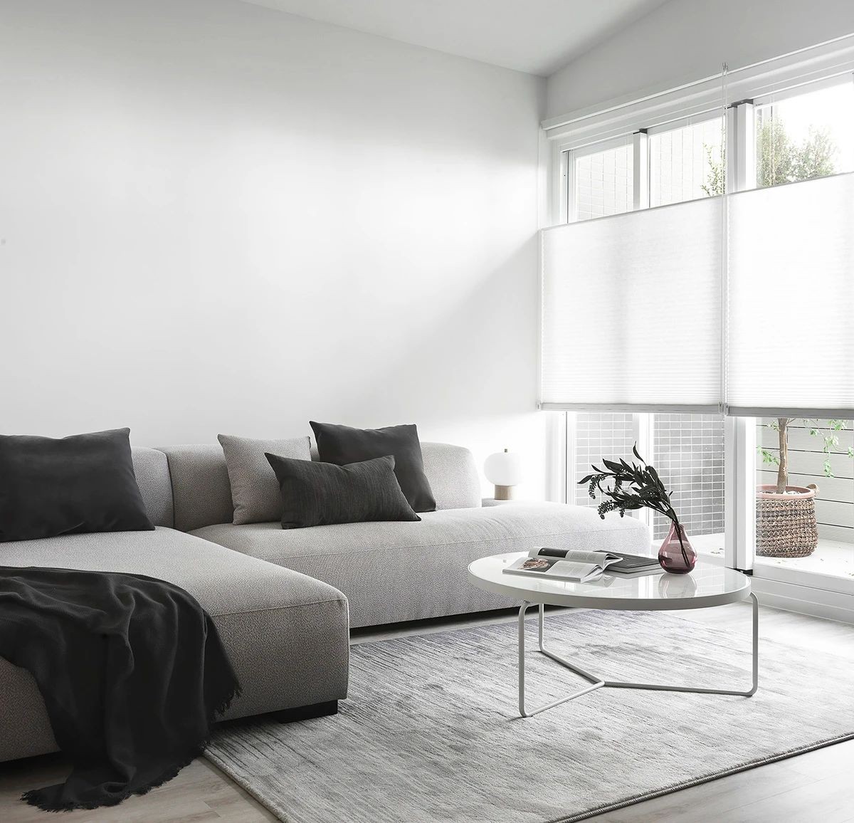 L 型沙发与极简圆边桌 呈现一家四口闲静安稳的光景 落地大窗装置易调整的风琴帘 使光线温柔蔓延流动
