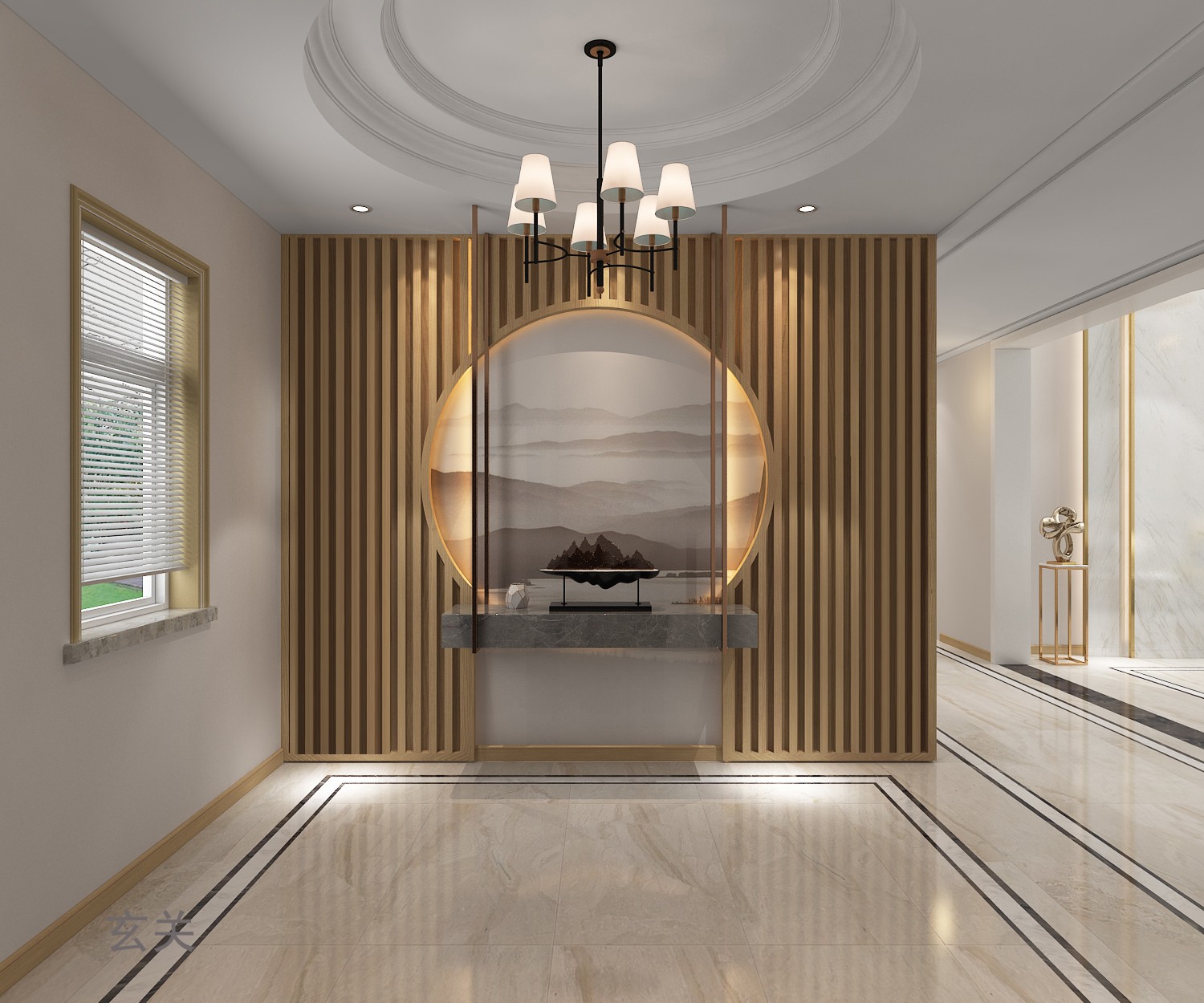 入户玄关为格栅搭配大理石台面营造一种新中式的氛围