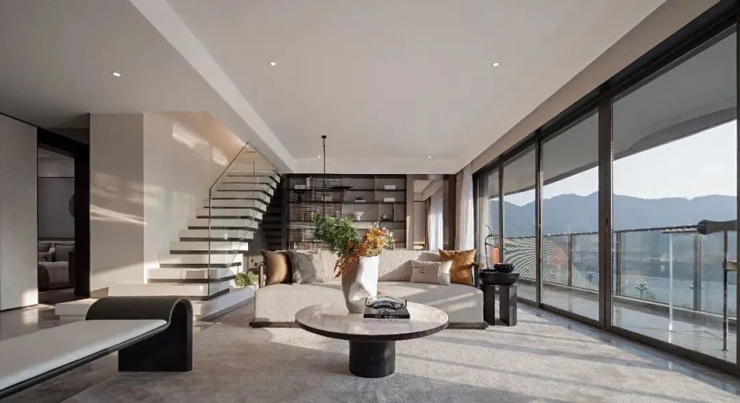 客厅休闲会客区域一角,简约轻盈的艺术单椅和会客中心区域的软糯饱满的休闲沙发形成了视觉上轻与重交替的节奏,而一旁的山石塑形模样的边几,有着长江两岸俊朗山峰的棱角分明,在此安置上一杯一盏的纯白简素茶具,即使不起身踏入身旁直面长江的宽大江景阳台,轻闭双眼安坐此处仿佛也能眺望到江面的微风逐浪。