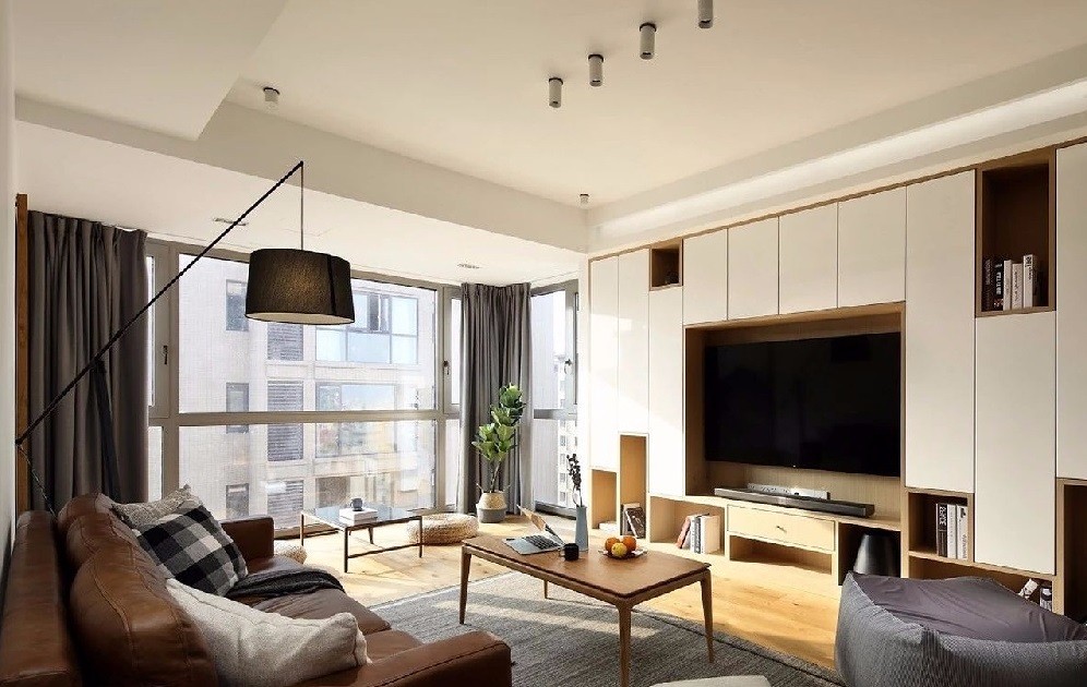 木色框架白色柜门打造收纳电视背景墙,丰富储物空间,拼搭出质感的生活场域,打通阳台纳入客厅,增加使用空间,设置为阳光茶室