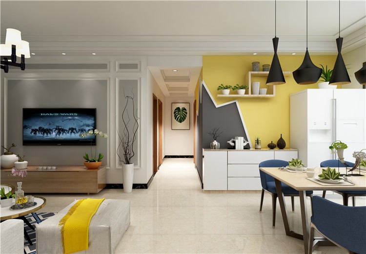 客厅运用线性构成规划简明利落的极简格调,再用大面积灰蓝色调。