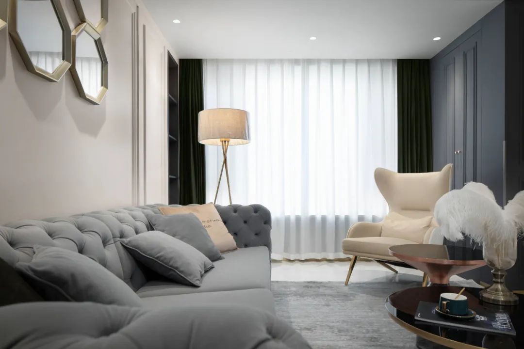 客厅以无主灯的天花造型,电视墙整体雅白的大理石背景墙与悬空电视柜,结合精致优雅的圆形小茶几,搭配灰色布艺沙发,沙发墙上的六边形挂镜组合,使得整个客厅都充满华丽端庄的气质。