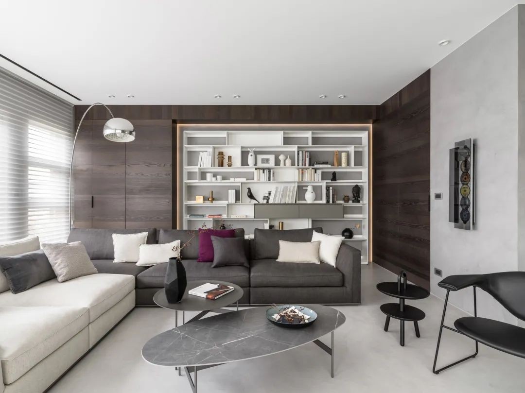 圆形+椭圆形双拼组合的灰色岩板茶几,搭配灰白配的沙发,后方定制一排收纳展示柜,也让空间显得格外的端庄优雅而有趣。