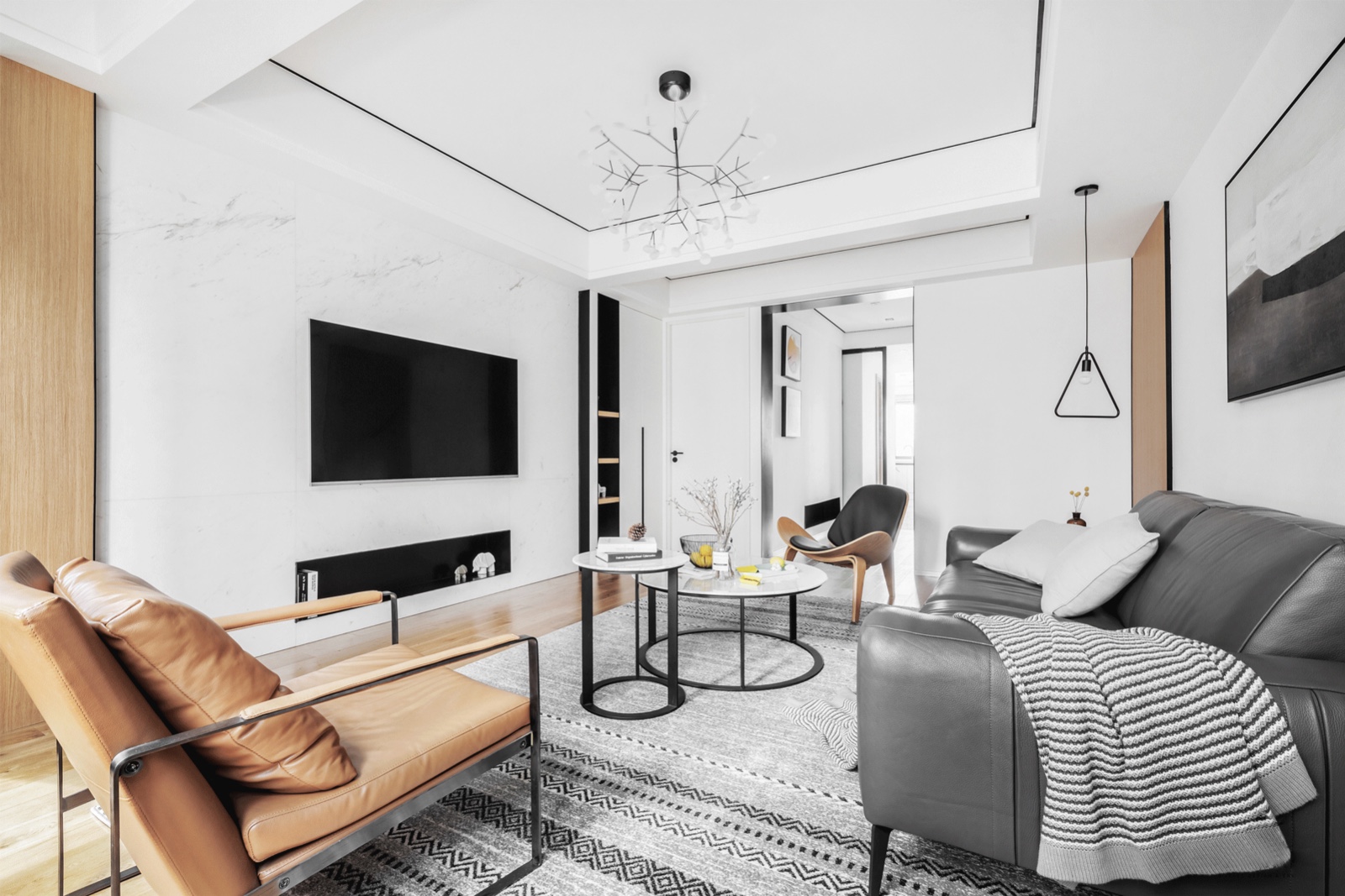 客厅仍然以白色为主色调,通过原木色的融入以及灰色的过渡,呈现简洁明快的生活气息。