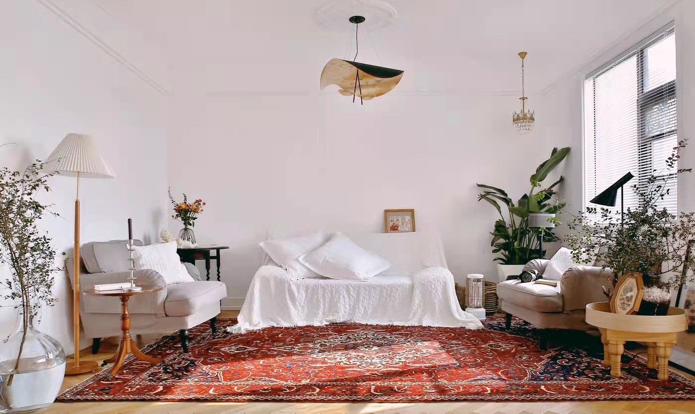 客厅温馨浪漫,红色地毯是点睛之笔,显得整个空间十分浪漫。