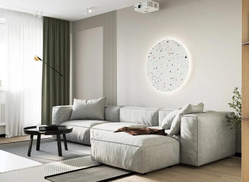 在客厅的设计中浅灰色的沙发搭配黑色的圆形茶几根据屋主的使用需求 设计师将原本的电视替换成了投影仪