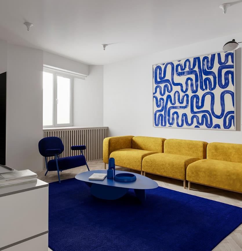 客厅配置简约造型家具 撞色搭配提升空间鲜亮气质 同步点缀抽象线条挂画增添艺术氛围曲线与三角茶几形成呼应