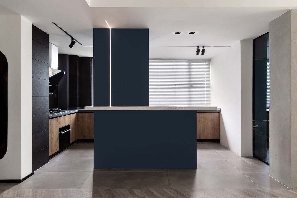 蓝色作为吧台结构穿插的主角,配合上开放式厨房的黑色瓷砖和木色门板,通过色彩让空间在视觉上产生区域的划分。