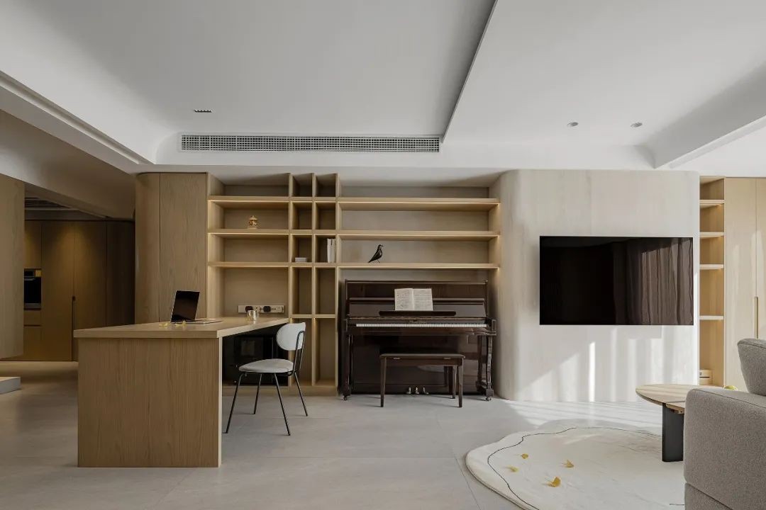 客厅是个多功能复合区域,包含男主人所需的书房区和女主人所需的钢琴区,桌椅柜体等家私在选型、细部与营造方式上都质朴而轻巧,为空间构筑疏密有度的表里关系。