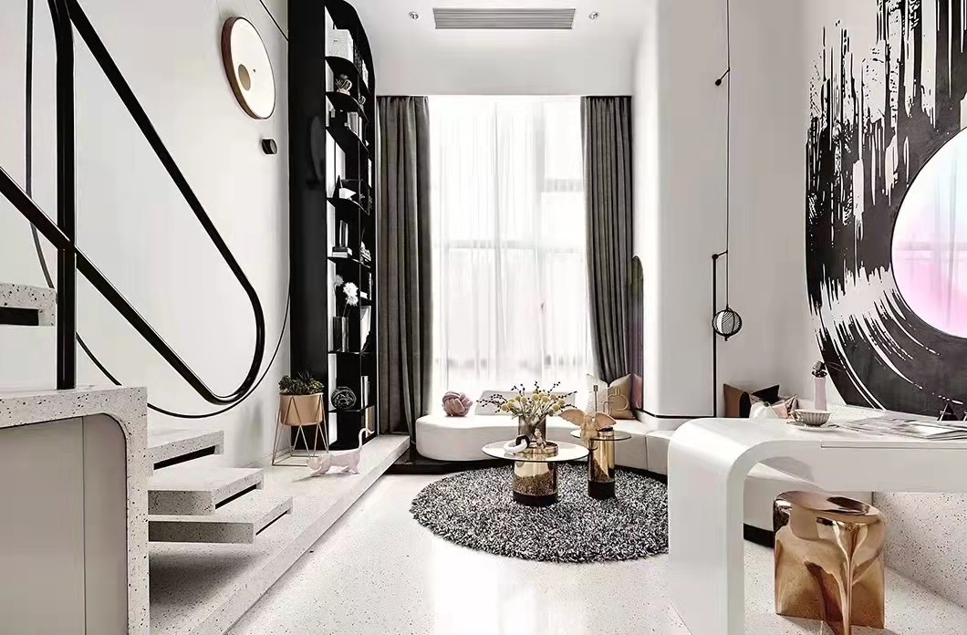采用橡木、水磨石等元素,如漂浮的楼梯、墙面板为人们带来了温暖感。